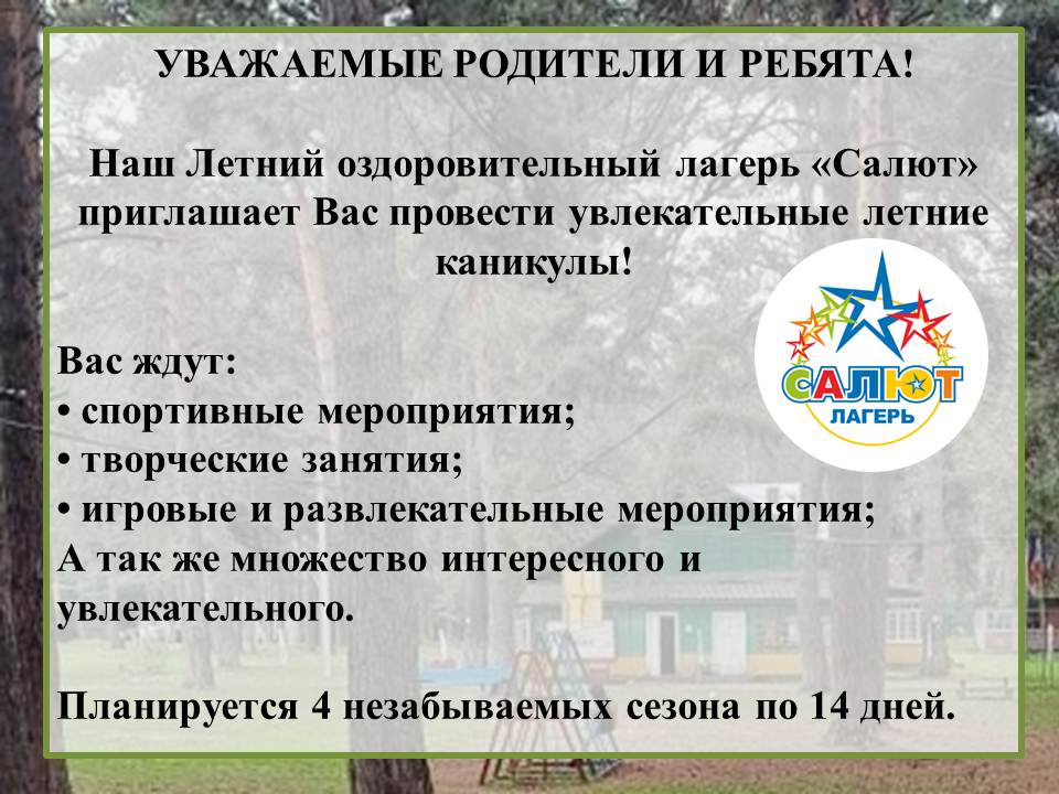 Оздоровительный лагерь "Салют" приглашает Вас привести увлекательные летние каникулы!